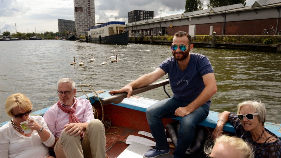 At its helm on the weekly tours – for which Amsterdam city authorities have limited numbers to 12 – are a varied group of skippers with one thing in common: they are all refugees who have reached Amsterdam in similar circumstances to the boats they sail.
